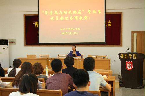 廉洁从政专题教育是毕业生党员离校前的最后一堂课,同时也是他们踏入社会、进入职场前的第一堂课,是兽医学院传统而特色的廉洁自律教育活动,迄今已连续举办12年,取得了很好的教育效果,受到广大师生和用人单位的一致好评。