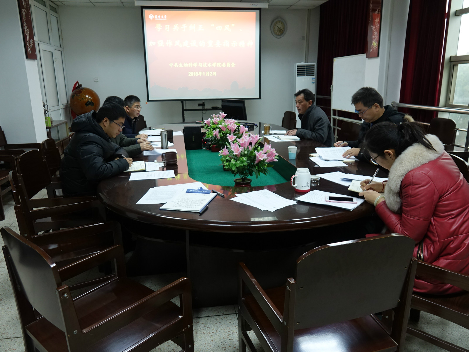 1月2日,生物科学与技术学院党委组织学习习近平总书记“纠正‘四风’不能止步,作风建设永远在路上”重要指示精神。院党委书记夏泽青主持学习会。全体院领导和办公室人员参加学习。