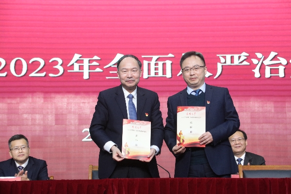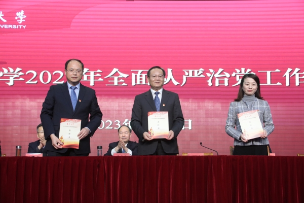 丁建宁在主持会议时强调,全校各级党组织、全体党员要始终保持全面从严治党永远在路上的政治清醒,进一步提高政治站位,坚决落实全面从严治党新要求,切实把思想和行动统一到校党委全面从严治党的部署要求上来,把会议精神转化为坚定理想信念、锤炼党性、忠诚履职的思想自觉和实际行动,切实扛起管党治党政治责任,凝心聚力向着新的奋斗目标再出发,奋力开创全面从严治党新局面。要切实增强履行全面从严治党主体责任的思想意识,坚持以问题为导向,始终把管党治党作为最根本的政治责任,以更加坚韧的定力纵深推进全面从严治党,将各项责任清单落到实处,层层压实全面从严治党责任,保证责任落地、任务见效,奋力推进学校事业发展迈上新台阶。要戮力同心实现全面从严治党的目标任务,牢牢把握 “聚焦‘双一流’、改革再奋进、推动新实践”的年度工作总基调,把全面从严治党与学习贯彻党的二十大精神、推动学校内涵建设高质量发展结合起来,围绕校第四次党代会确立的目标任务、年度党政重点工作等切实强化纪律要求,切实以全面从严治党的新成效,为谱写高水平研究型大学建设现代化新篇章保驾护航作出新的更大贡献。