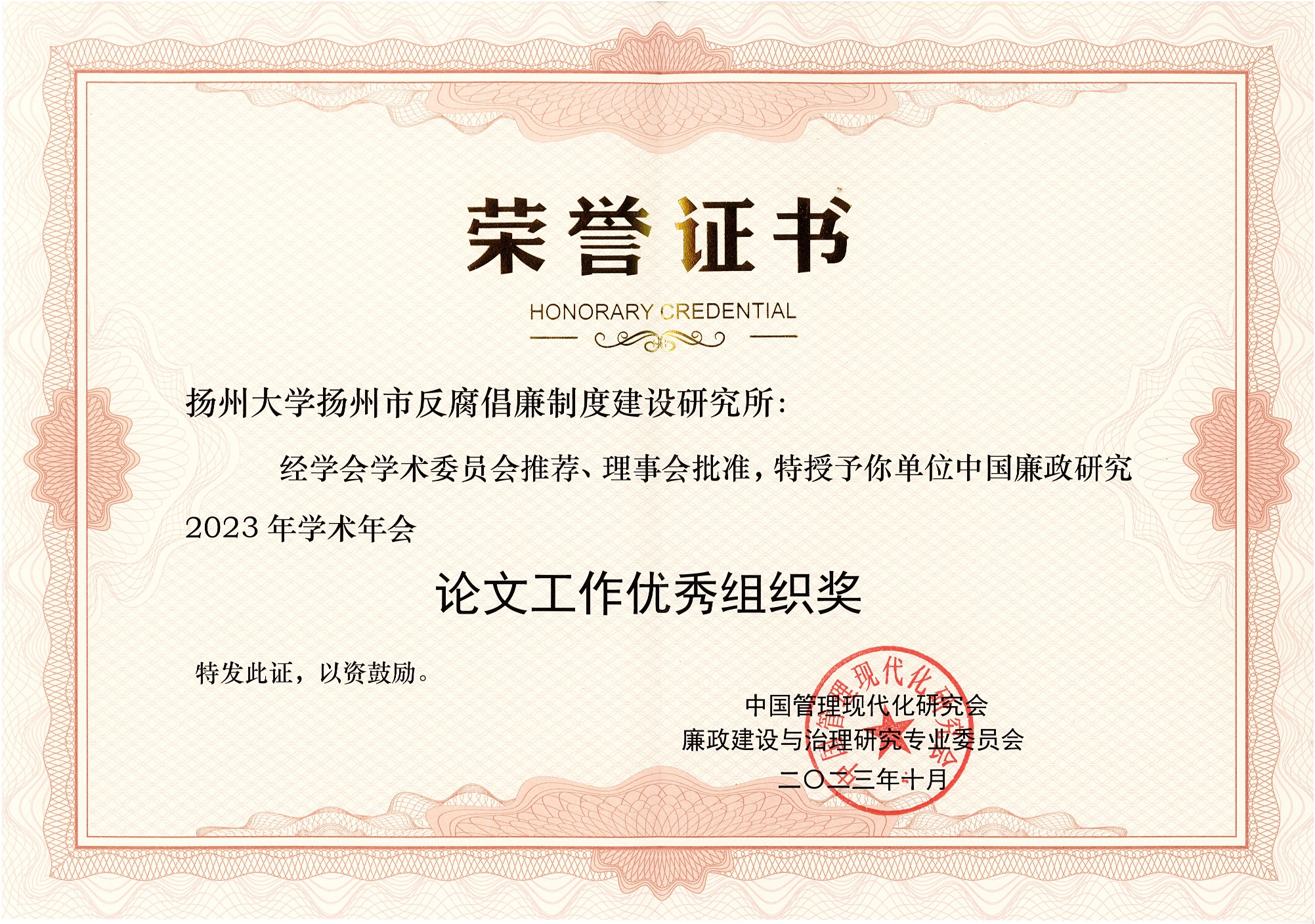 10月13-15日,校纪委组织参加在浙江省杭州市举办的中国廉政研究2023年学术年会。我校纪委与北京大学政府管理学院、中国政法大学国家监察研究院等8家单位荣获“中国廉政研究2023年学术年会论文工作优秀组织奖”,这是我校纪委第4次获此奖项。校纪委书记、派驻监察专员邱庆峰当选学会理事。