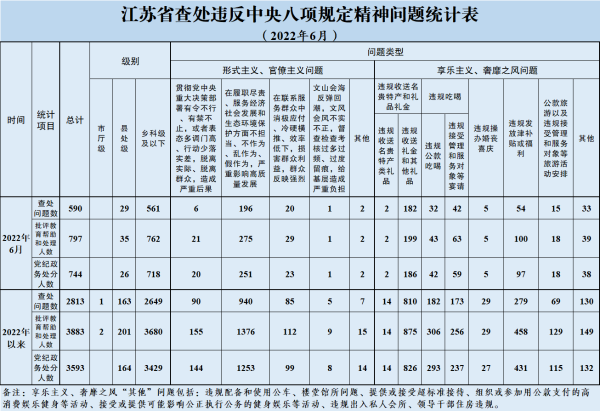 2022年6月,全省共查处违反中央八项规定精神问题590起,批评教育帮助和处理797人、其中给予党纪政务处分744人。从问题类型看,查处形式主义、官僚主义问题225起、批评教育帮助和处理328人,查处享乐主义、奢靡之风问题365起、批评教育帮助和处理469人。从人员级别看,批评教育帮助和处理县处级干部35人、乡科级及以下人员762人。