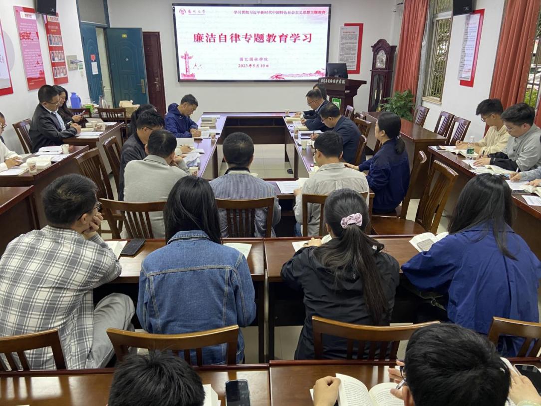 5月10日,园艺园林学院党委理论学习中心组召开廉洁文化建设专题学习会,集中学习了《中国共产党廉洁自律准则》《中国共产党纪律处分条例》《新时代高校教师职业行为十项准则》等文件。会议强调,学院全体教师要切实加强党风廉政建设和师德师风建设,自觉培养高尚道德情操,积极弘扬中华民族传统美德,将廉洁自律内化于心、外化于行,永葆党的先进性和纯洁性。